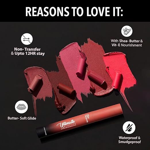 Introducing the Blue Heaven Ultimatte Non-Transfer Lip Crayon, the ultimate solution for those seeking intense, long-lasting lip color with an ultra-matte finish. This Red lipstick crayon is designed to deliver a rich, high-impact color that lasts for up to 12 hours, ensuring your lips stay vibrant and bold all day without the need for constant touch-ups. The non-transfer, smudge-proof formula sets within 2-3 minutes of application, locking in a flawless matte finish that won’t smudge, bleed, or transfer. Whether you're sipping coffee, enjoying a meal, or going about your busy day, your lip color remains intact giving you the confidence to move through your day without worrying about reapplying. One of the standout features of this lip crayon is its butter-soft, glossy glide. When you first apply it, you’ll experience a smooth, glossy texture that feels luxurious and soft on your lips. In just a couple of minutes, the formula transforms into a weightless, ultra-matte finish that stays put for hours. The smooth application makes it easy to apply, ensuring precise lines and even coverage every time. Formulated with shea butter and vitamin E, this lip crayon not only delivers stunning color but also cares for your lips. In addition to being smudge-proof, this lip crayon is also waterproof, providing an extra layer of durability. Rain, sweat, or humidity won’t affect your lip look, making it the perfect choice for long days, special occasions, or any time you need lip color that lasts. Whether you're heading to the office, out for a night on the town, or simply want a bold look that lasts, this lip crayon will give you the confidence to rock any occasion with ease.